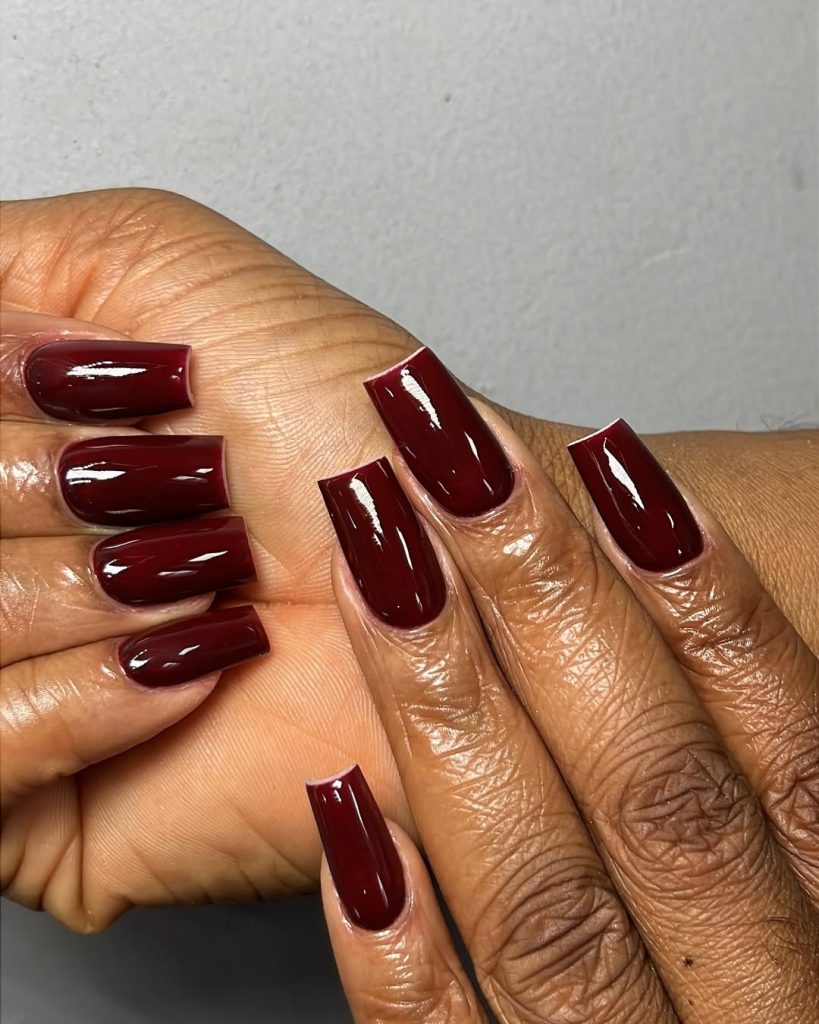 8. Dark Cherry Red Square Nails with Graphic Shine