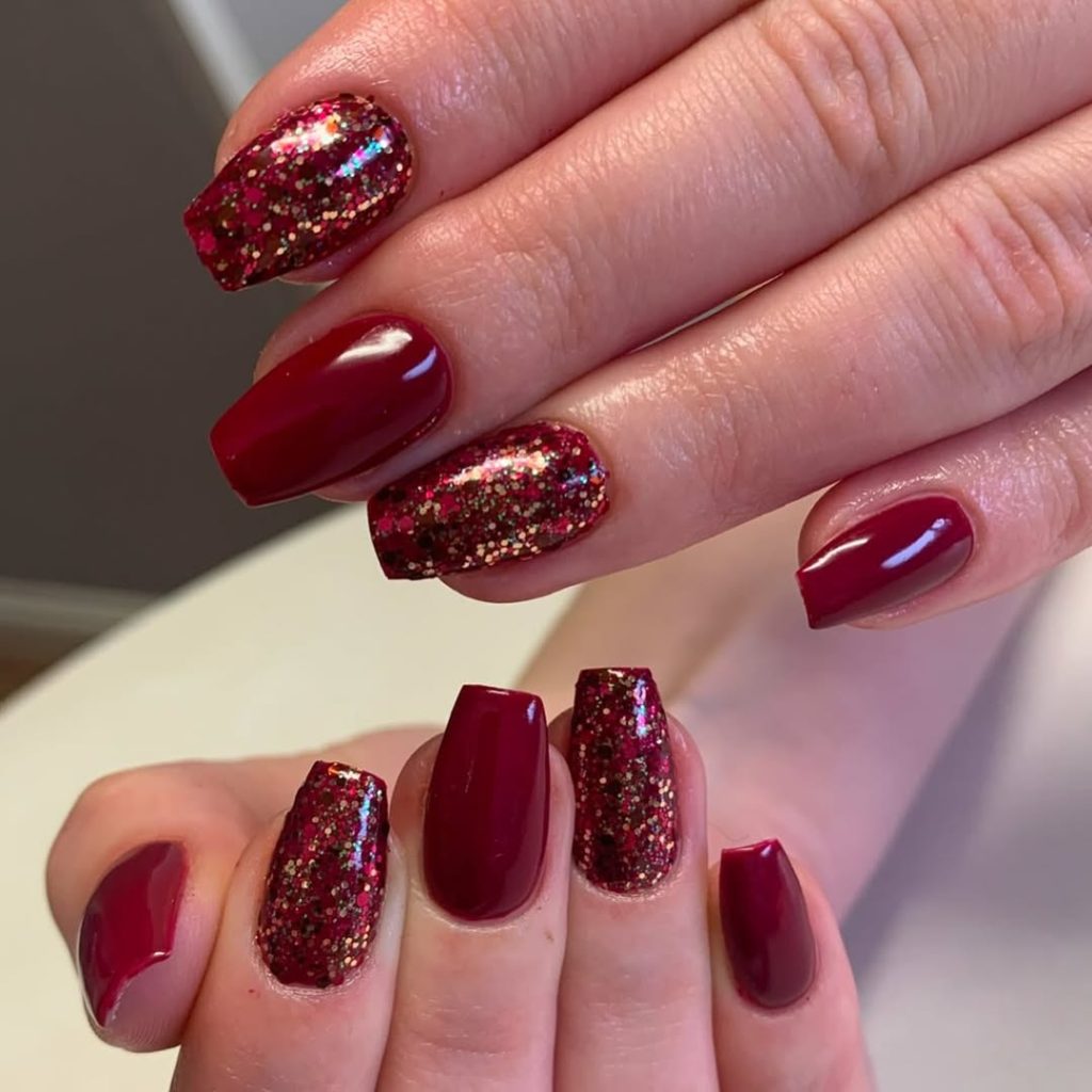 This look is a wonderful choice for designs on short square or medium square nails, especially during holidays or Christmas events. The glitter art adds interest without overwhelming the base color, making it surprisingly wearable. If you want Inspo that feels festive but still polished, this combination of classic Polish and sparkle strikes a beautiful balance.