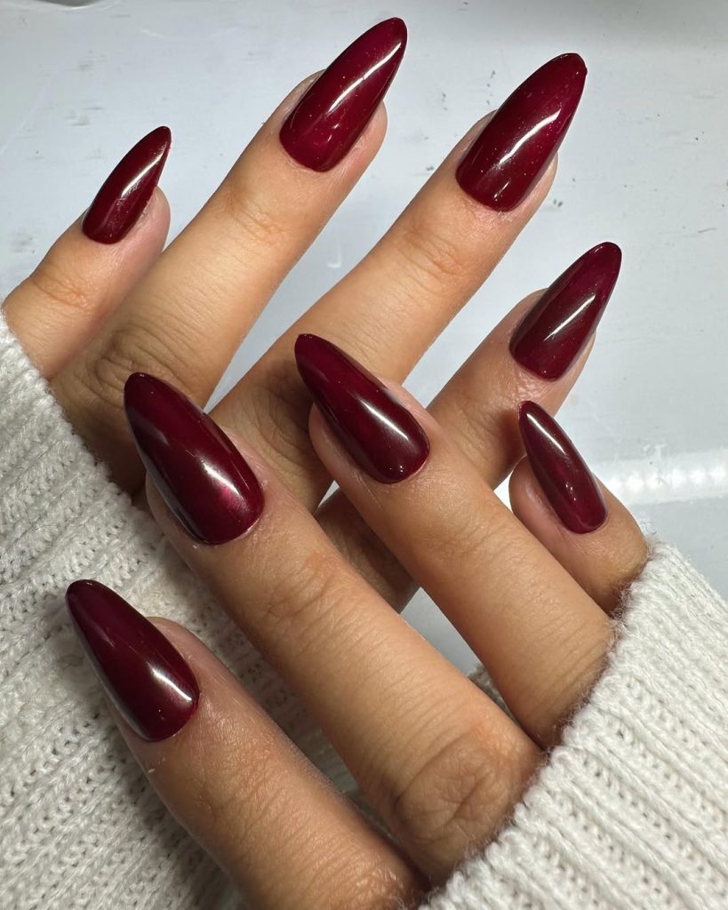 27. Dark Cherry Red Almond Nails with Minimal Shine