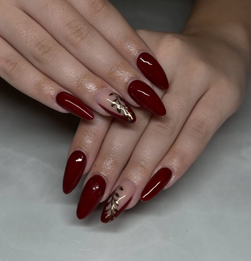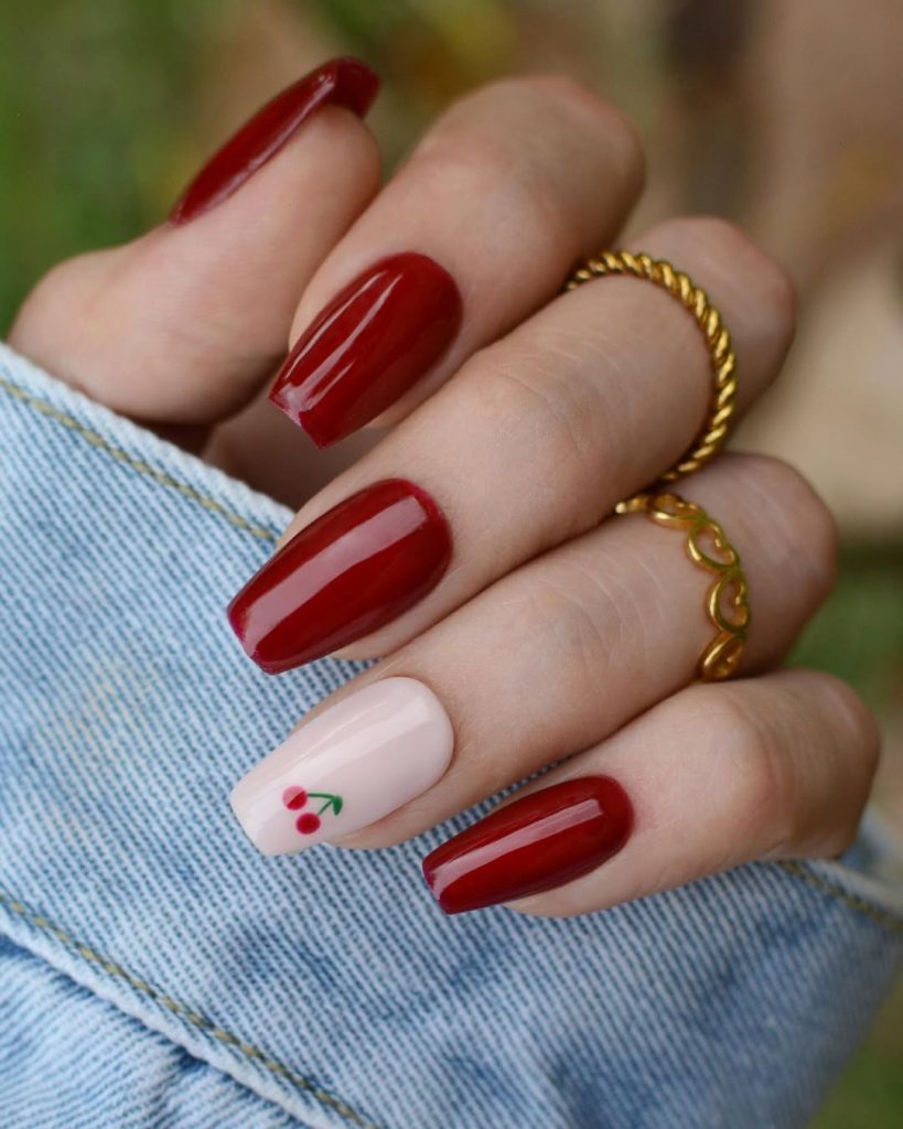 10. Cherry-red almond nails with a subtle art accent