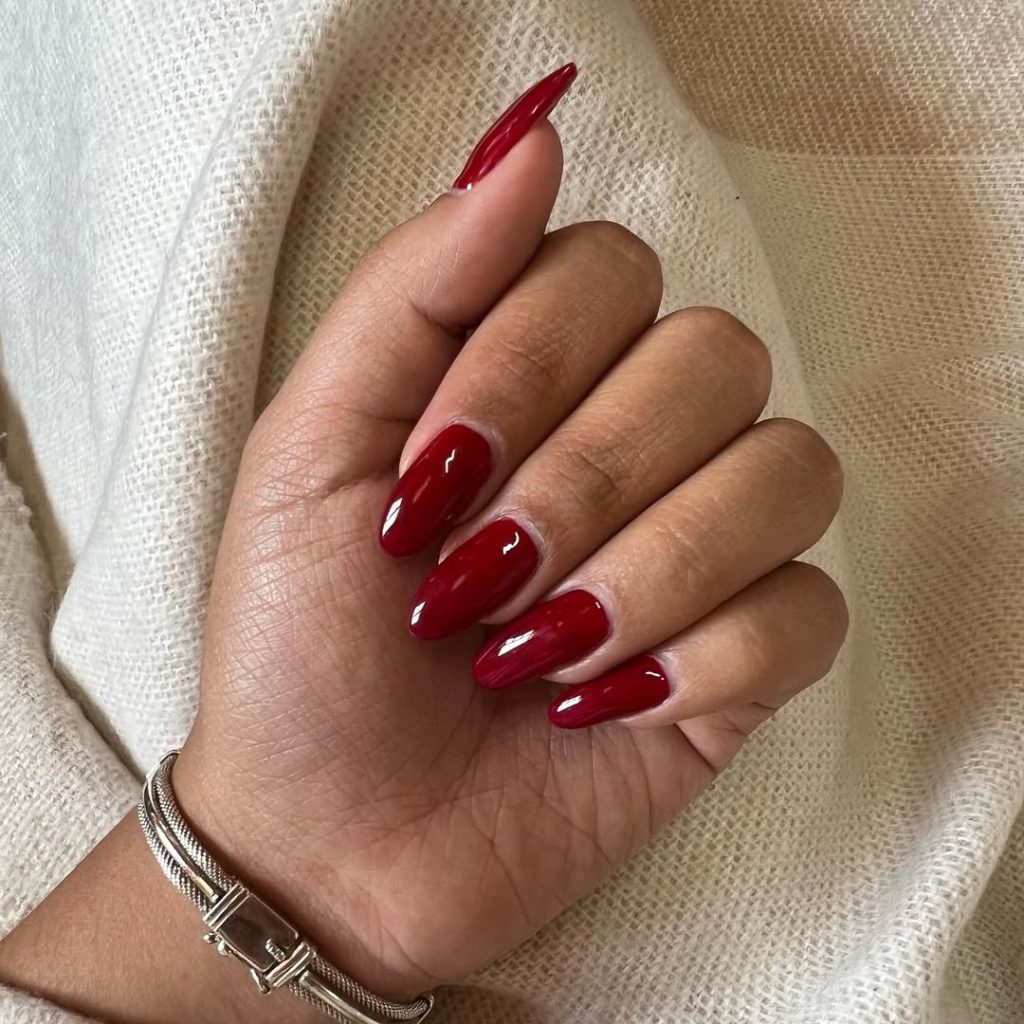 This look is perfect for anyone who values ideas that work everywhere, every day. Almond nails soften the hands, while the smooth finish keeps maintenance easy. If you’re ever unsure what to choose, this style is proof that classic cherry red will never let you down.