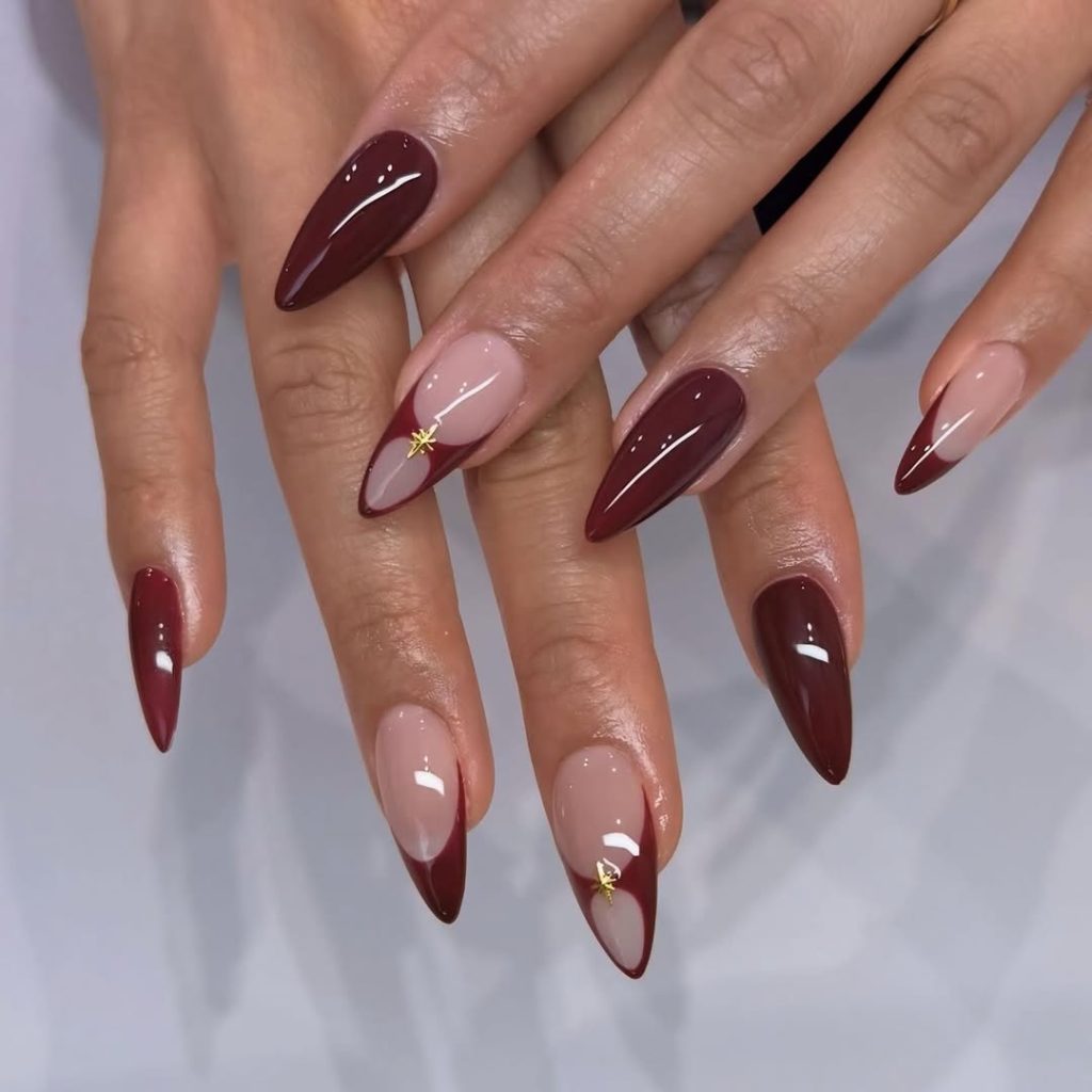 14. Cherry-red almond nails with gold star accents