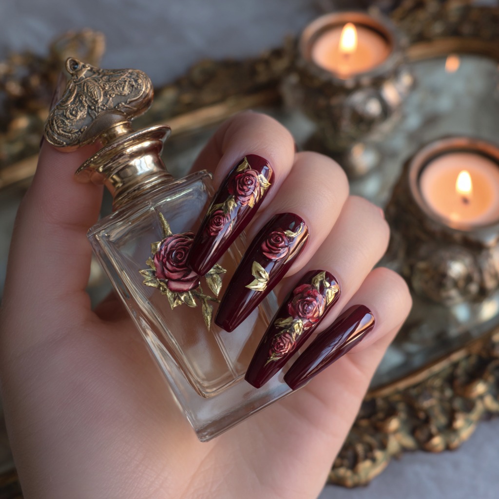 This manicure feels like wearable art. The rich cherry base combined with delicate gold floral paint details gives off an almost vintage, romantic vibe—like an heirloom perfume bottle or a handwritten love letter. It’s bold, expressive, and undeniably feminine, perfect for someone who loves designs that tell a story. There’s a sense of drama here, but it’s tasteful and beautifully balanced.