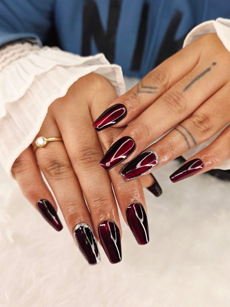 This set feels moody in the best possible way. The deep dark cherry tone paired with a subtle cat-eye shimmer creates a sense of mystery that’s incredibly chic. It’s the kind of manicure that catches the light when you least expect it, adding dimension and depth without crossing into flashy territory. There’s an almost velvety richness here that feels cozy, confident, and quietly powerful.