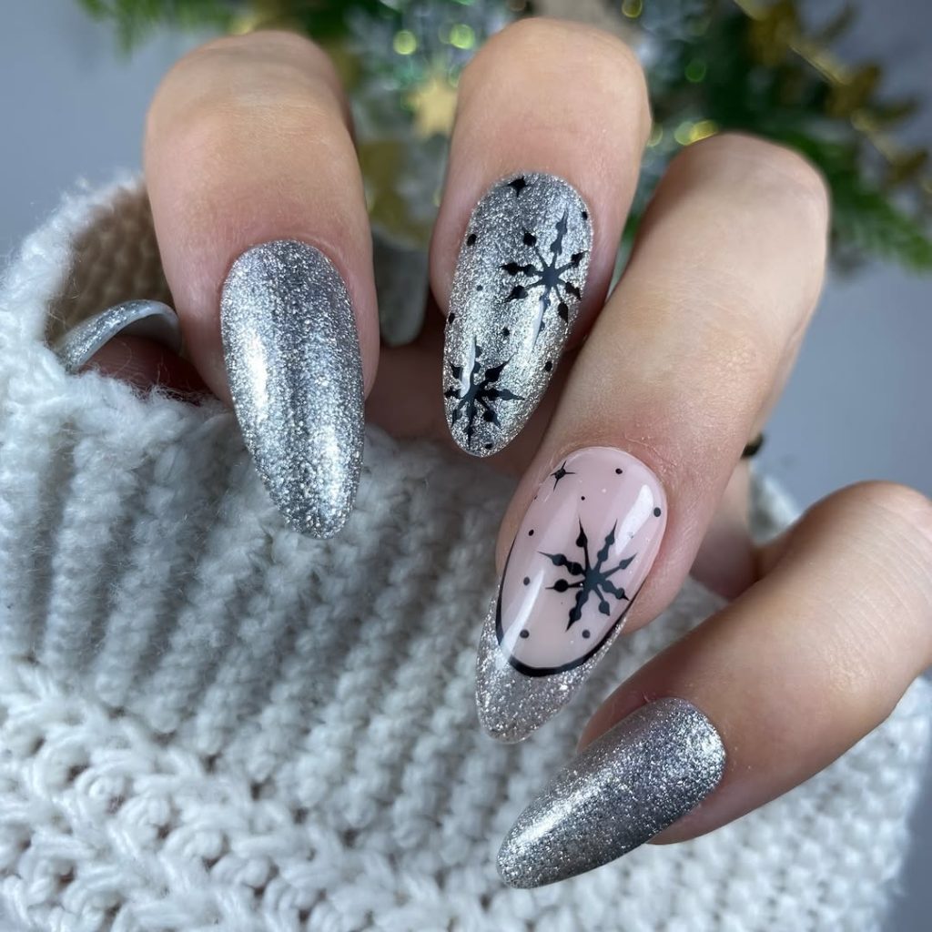 This design is perfect for women who enjoy winter silver glitter accents and a more subtle festive vibe. The almond shape elongates the fingers, while the delicate details make it versatile for any event. It’s a great option if you want nails that sparkle but still feel sophisticated.