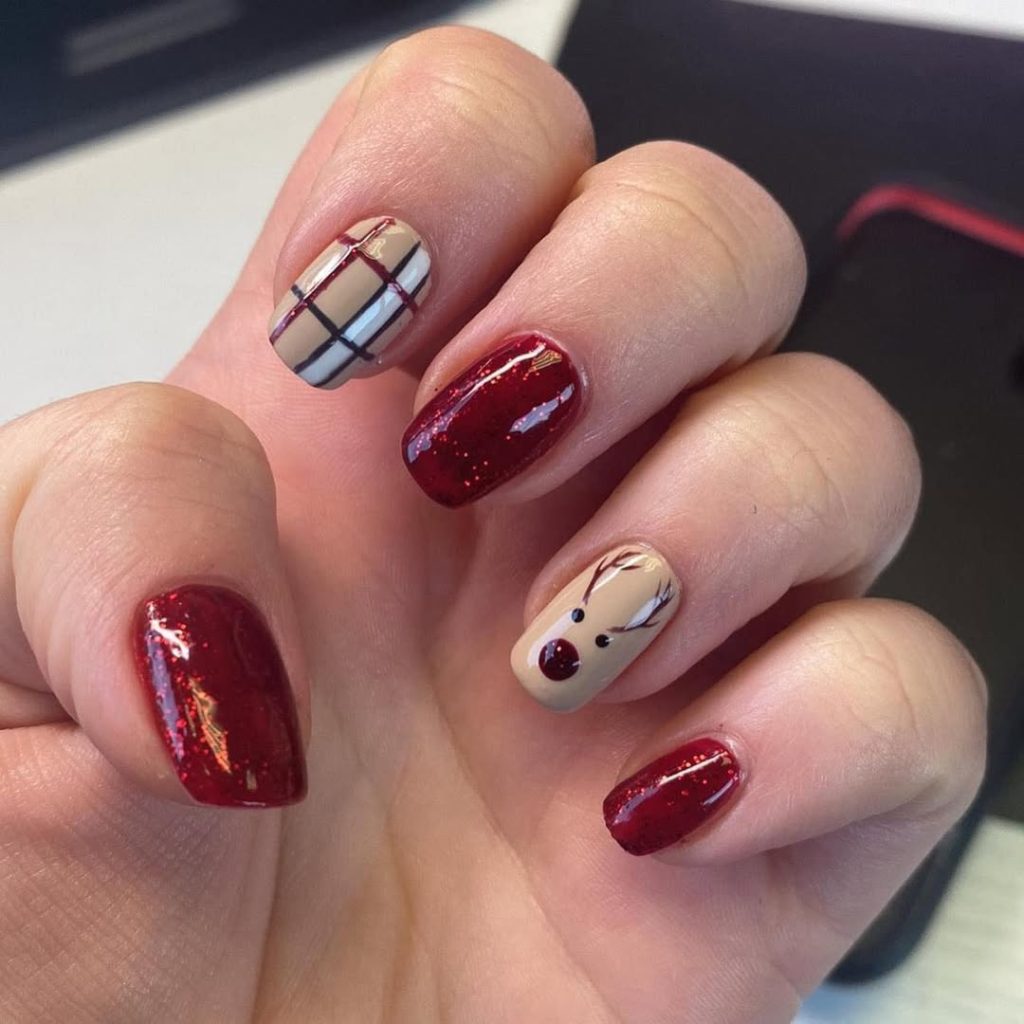 This design is great for women who want something trendy but still easy to wear day-to-day. The plaid gives it a fashionable twist, while Rudolph keeps it whimsical. It works beautifully on short nails and pairs effortlessly with holiday outfits — from plaid scarves to little black dresses.