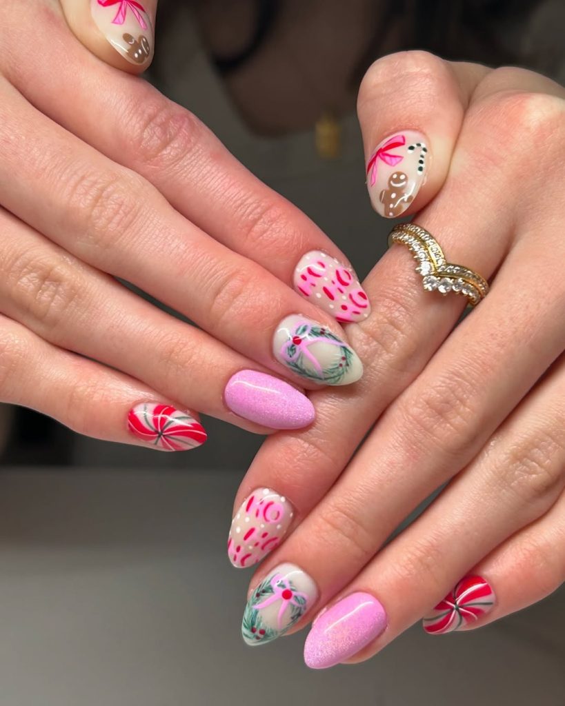 Playful and colorful, these nails capture the joy of unwrapping gifts and hanging wreaths during the holiday season. From candy cane stripes to gingerbread accents and wreath details, every nail feels like a tiny piece of holiday décor. The mix of pink sparkle, bright red, and green adds a fun, cheerful vibe, making this one of the cutest Christmas nail art designs 2025.