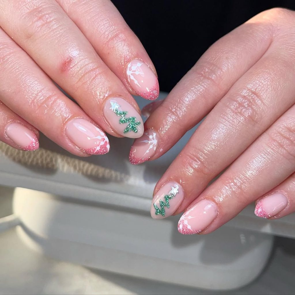 Classic French tips get a magical update with pink glitter edges and tiny green Christmas trees at the center. It’s a delicate yet festive take that feels modern but keeps the tradition alive. The added snowflakes on soft nude polish make the look enchanting, making this one of those simple Christmas nail art designs 2025 that never goes out of style.