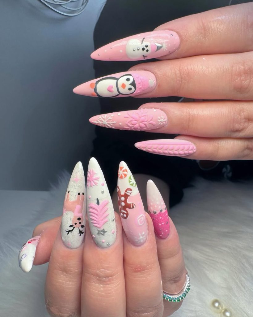 This pink set feels like stepping into a whimsical winter wonderland. With snowmen, penguins, reindeer, and gingerbread details, it’s a storybook come alive at your fingertips. The textured snowflakes and knitted patterns add depth, making it one of the most detailed and playful Christmas nail art designs 2025.