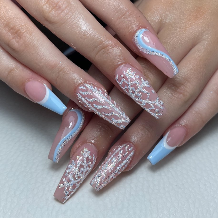 This manicure is perfect for women who like modern winter nails with a touch of glamour. The coffin shape offers enough space for intricate detailing, while the blend of blue and silver suits holiday parties and everyday looks alike. It’s a versatile design that shines especially well with icy-toned jewelry and cozy winter coats.