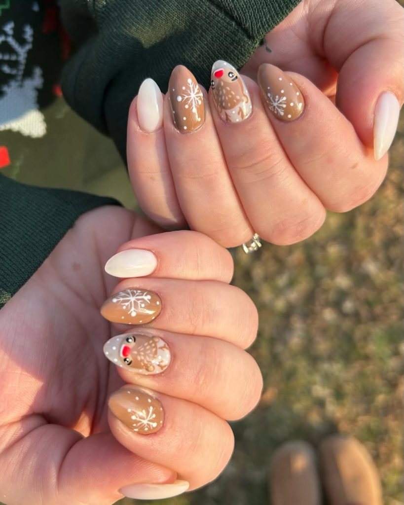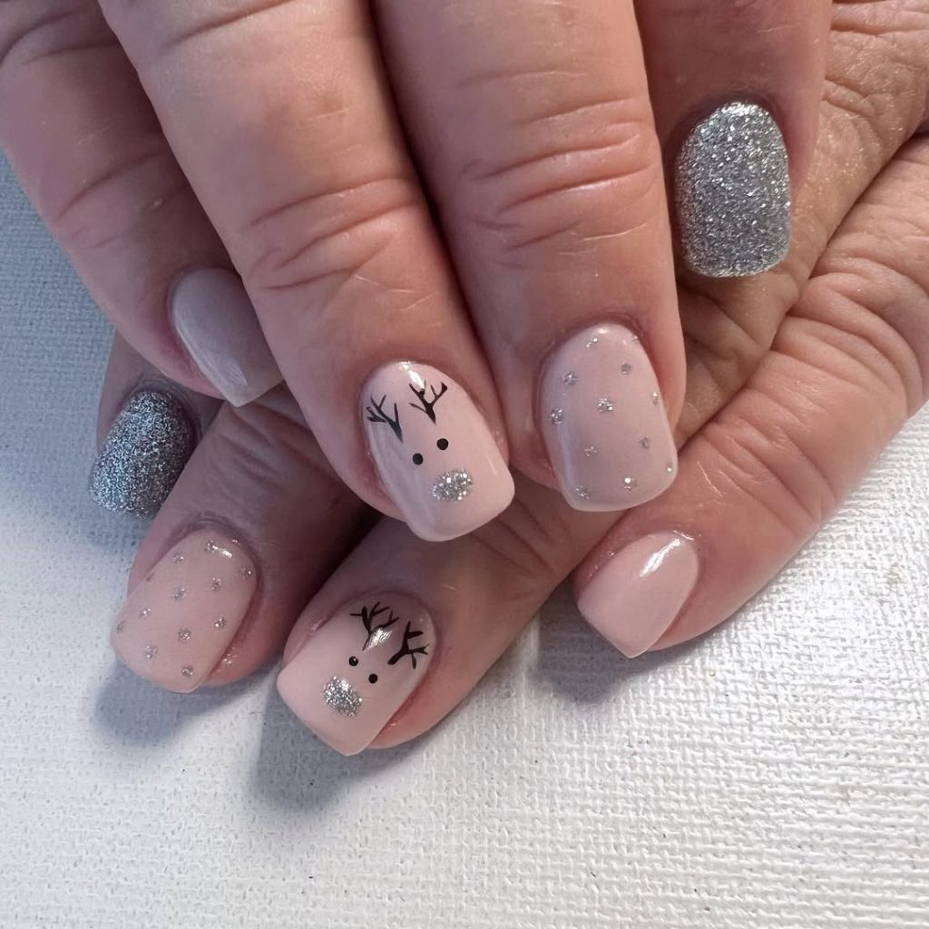 Soft nude nails dotted with tiny silver glitter are delicate on their own, but when you add reindeer faces with sparkly noses, they become irresistibly festive. This look feels like a sweet nod to childhood Christmas stories while still being chic enough for adults. It’s one of those Christmas nail art designs 2025 that feels timeless yet modern.