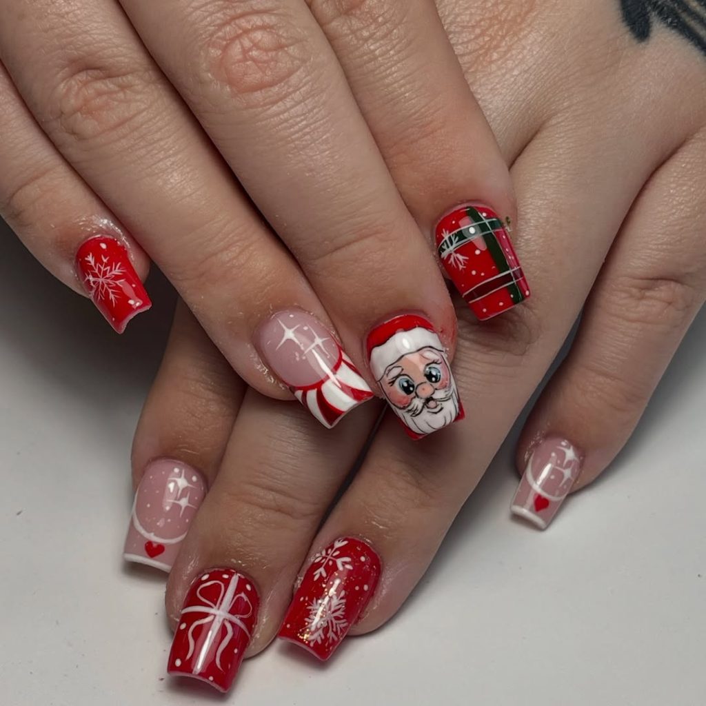 Bring the holiday spirit right to your fingertips with those joyful Santa nails. From candy cane swirls to wrapped gift designs and a smiling Santa face, everything is bursting with xmas sparkly red glitter charm. It’s a fun and bold set that makes Christmas nail art designs 2025 feel all that more magical.