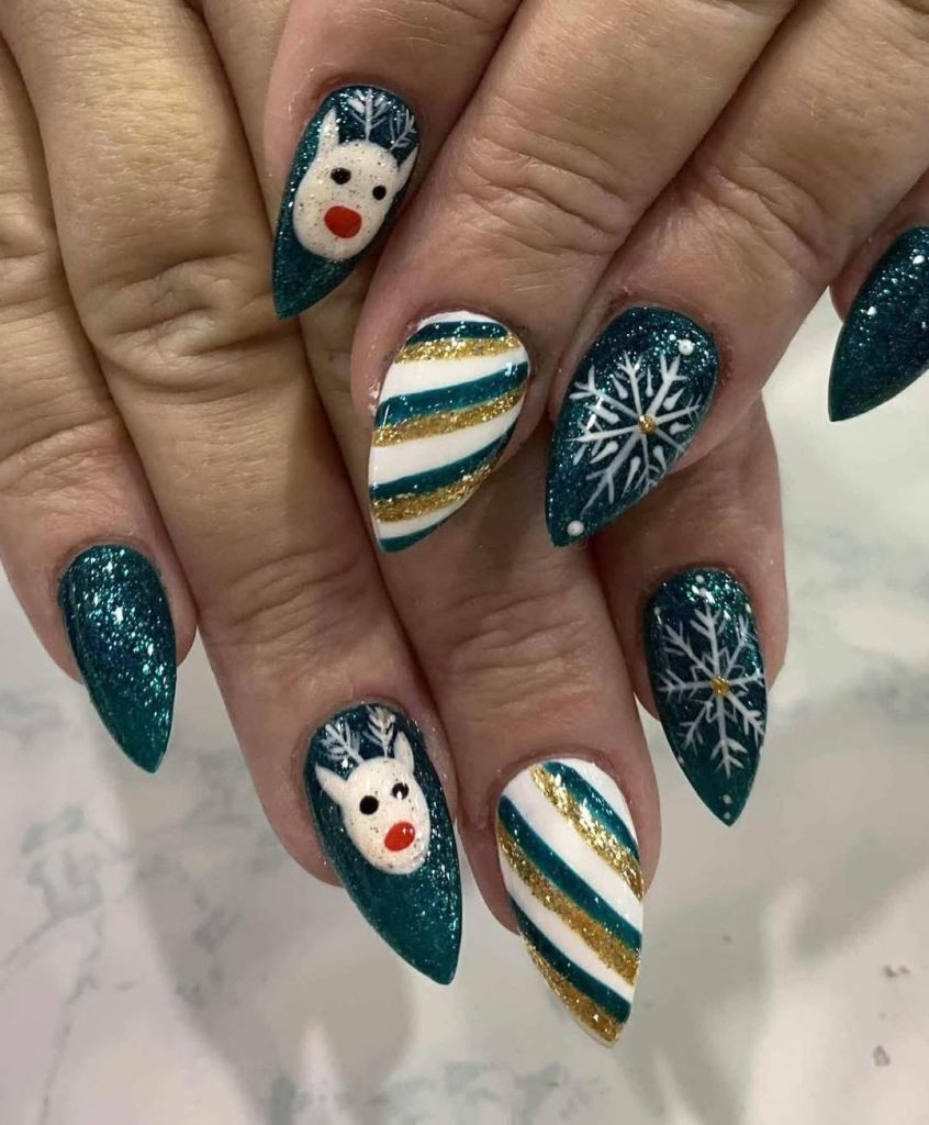 Teal glitter nails take on a fresh twist with Rudolph faces, golden stripes, and snowflakes. It’s playful yet elegant, adding variety to Christmas nail art designs 2025. The deep teal feels like winter nights, while the glitter makes them shine under the lights of the tree.