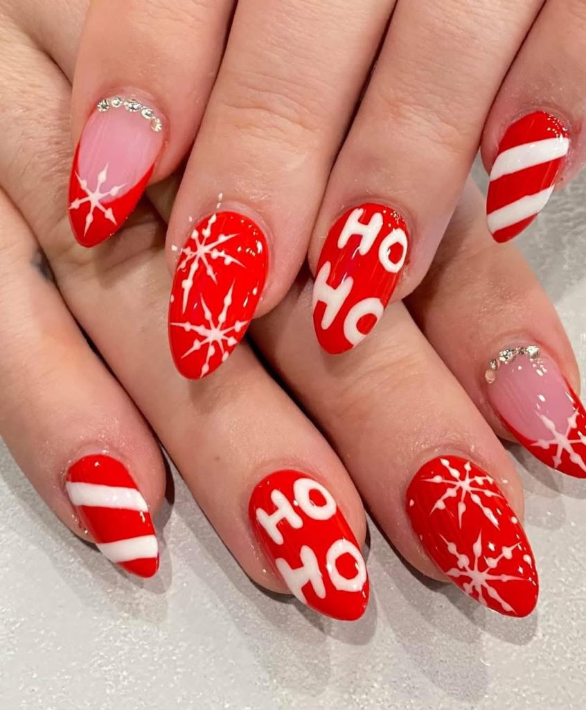 Bright red nails decorated with snowflakes, candy cane stripes, and playful “Ho Ho Ho” lettering make this set a holiday standout. Fun and bold, it’s one of those Christmas nail art designs 2025 that captures the playful side of the season perfectly.