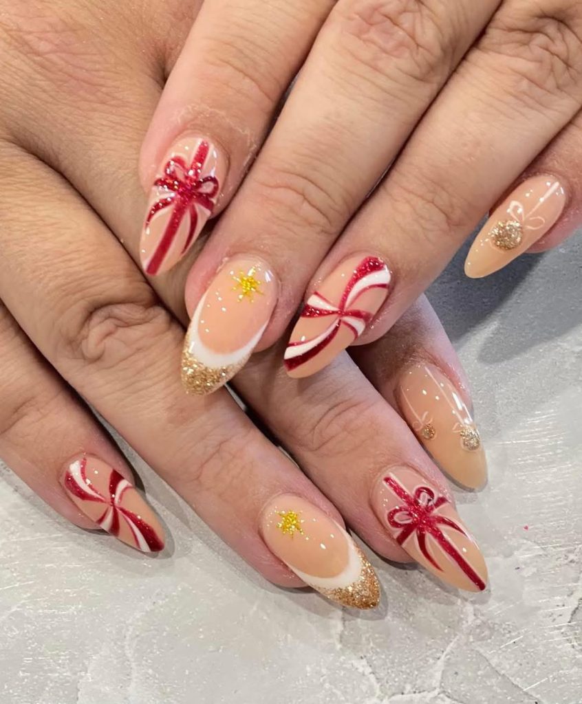 This style works for women who prefer a mix of glam and fun. The almond shape is practical yet elegant, and the neutral base lets the red bows and accents shine. It’s a great option if you want a holiday manicure that complements both casual and dressy outfits.