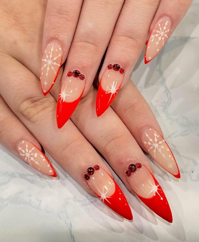 Chic and bold, these nails feature glossy red French tips adorned with snowflakes and glittering red gems. They’re striking and elegant, making them one of the most glamorous Christmas nail art designs 2025. The stilleto shape adds an edgy vibe while keeping the look festive.