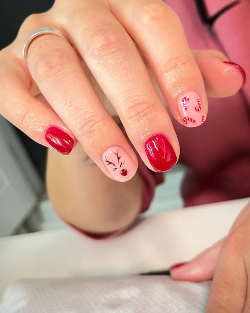 These short nails combine glossy red polish with playful accent art of Rudolph and candy canes. The mix of a nude base and festive details makes it simple yet spirited, an easy favorite among Christmas nail art designs 2025. It’s cheerful, cute, and perfect for everyday wear during December.
