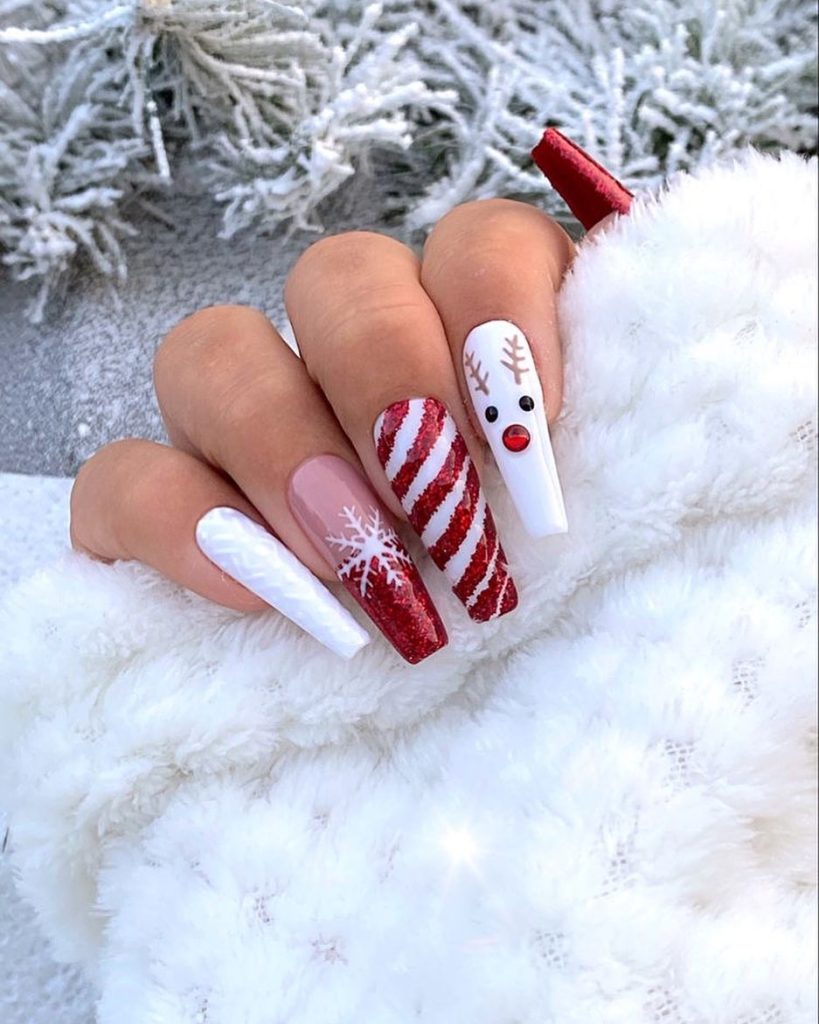 Bold and festive, these long coffin nails feature candy cane stripes, snowflakes, and a sweet Rudolph accent. The mix of glossy white and xmas sparkle red glitter makes them stand out, turning your nails into holiday showstoppers. This is one of the more dramatic Christmas nail art designs 2025, perfect for women who love to go all out.