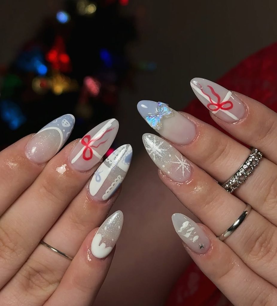 A frosty palette of white, silver, and soft blue brings this design to life. With bows, snowflakes, and even a holographic accent, these nails feel chic and elegant. It’s one of those Christmas nail art designs 2025 that’s festive but still refined, perfect if you prefer cooler tones over classic red and green.