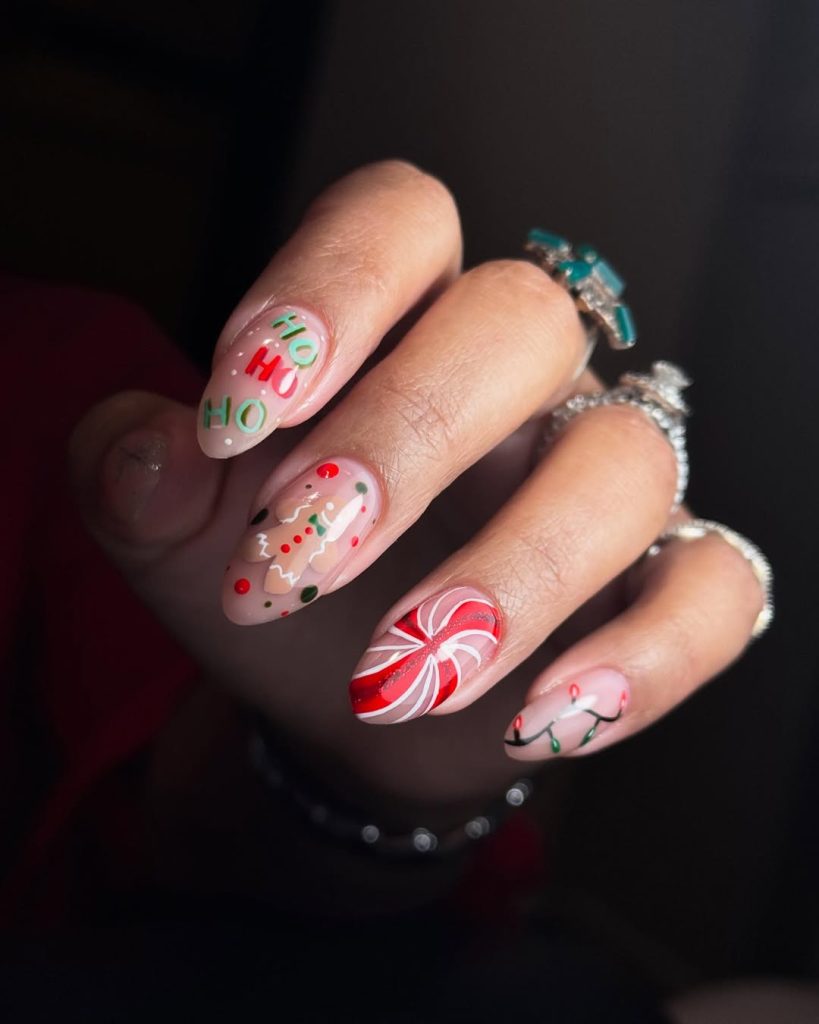 Cute and nostalgic, these nails showcase gingerbread men, candy swirls, holiday lights, and fun lettering. It’s like a playful Christmas party captured on your fingertips, making it one of the most cheerful Christmas nail art designs 2025.