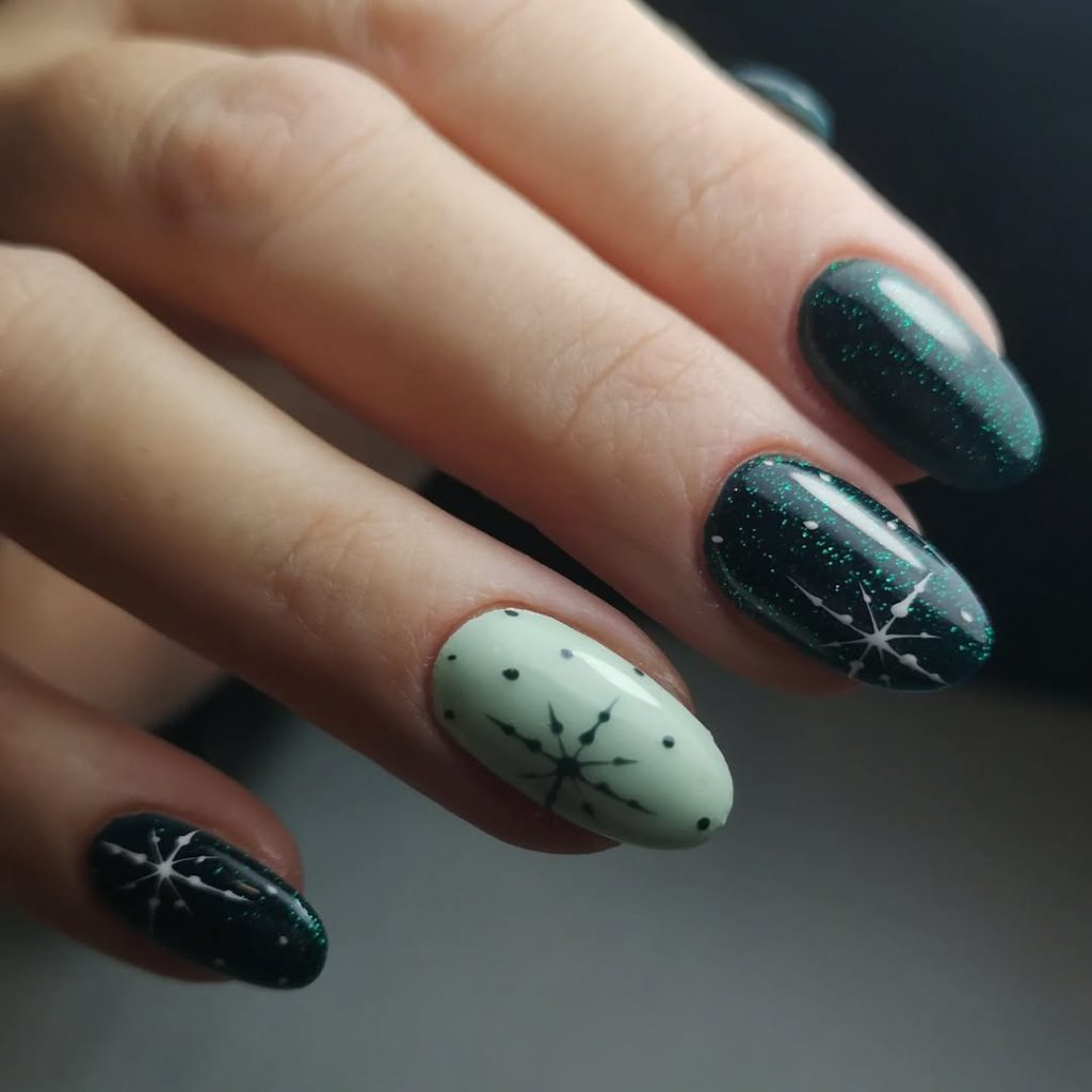These dark green glitter nails sparkle like a winter night sky, with delicate snowflakes and dotted accents adding a festive touch. The contrast of deep green and pale mint makes this one of the most stylish Christmas nail art designs 2025, perfect for women who want something chic and slightly edgy.