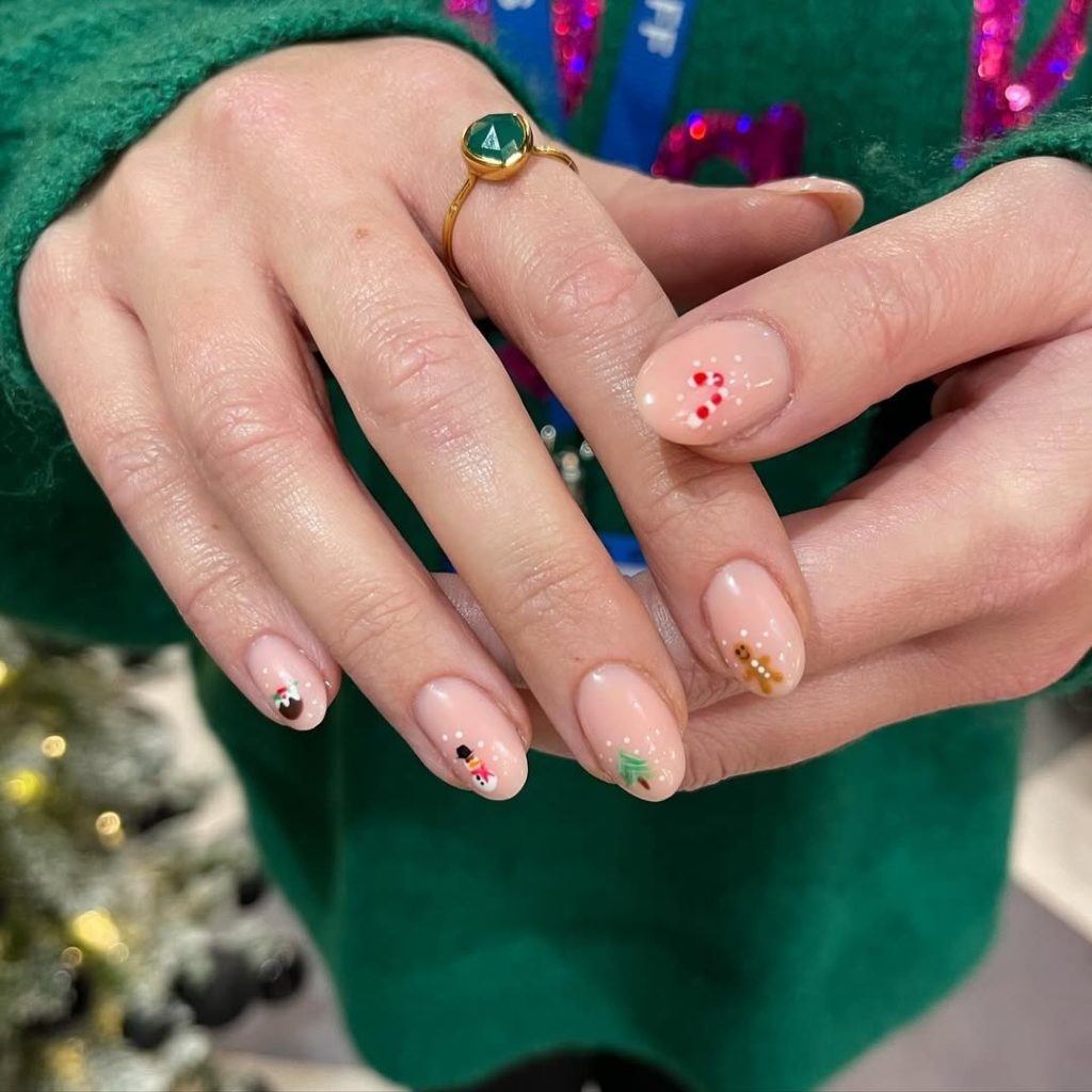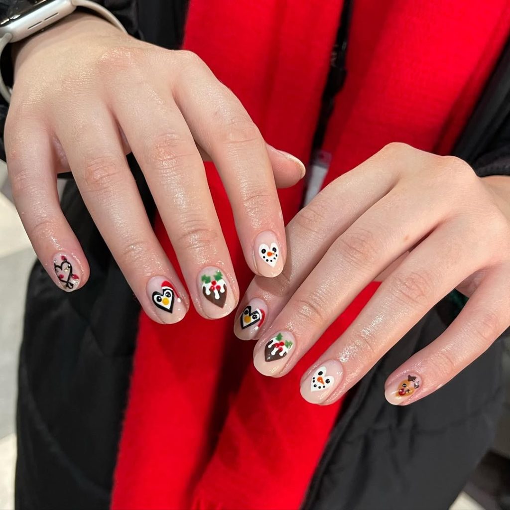 Sometimes less is more, and this manicure proves it. Tiny holiday icons like candy canes, snowmen, gingerbread men, and trees add festive charm without overwhelming the nude base. It’s a subtle but delightful take on Christmas nail art designs 2025.