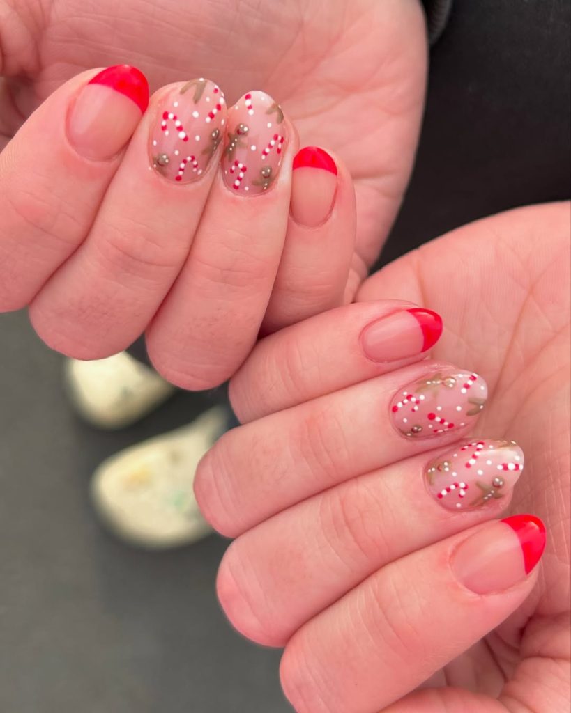 Classic red French tips get a playful holiday makeover with candy cane accents and sprigs of mistletoe. The clear base adds lightness, while the red tips keep it festive. This is one of those Christmas nail art designs 2025 that feels cheerful, polished, and timeless.