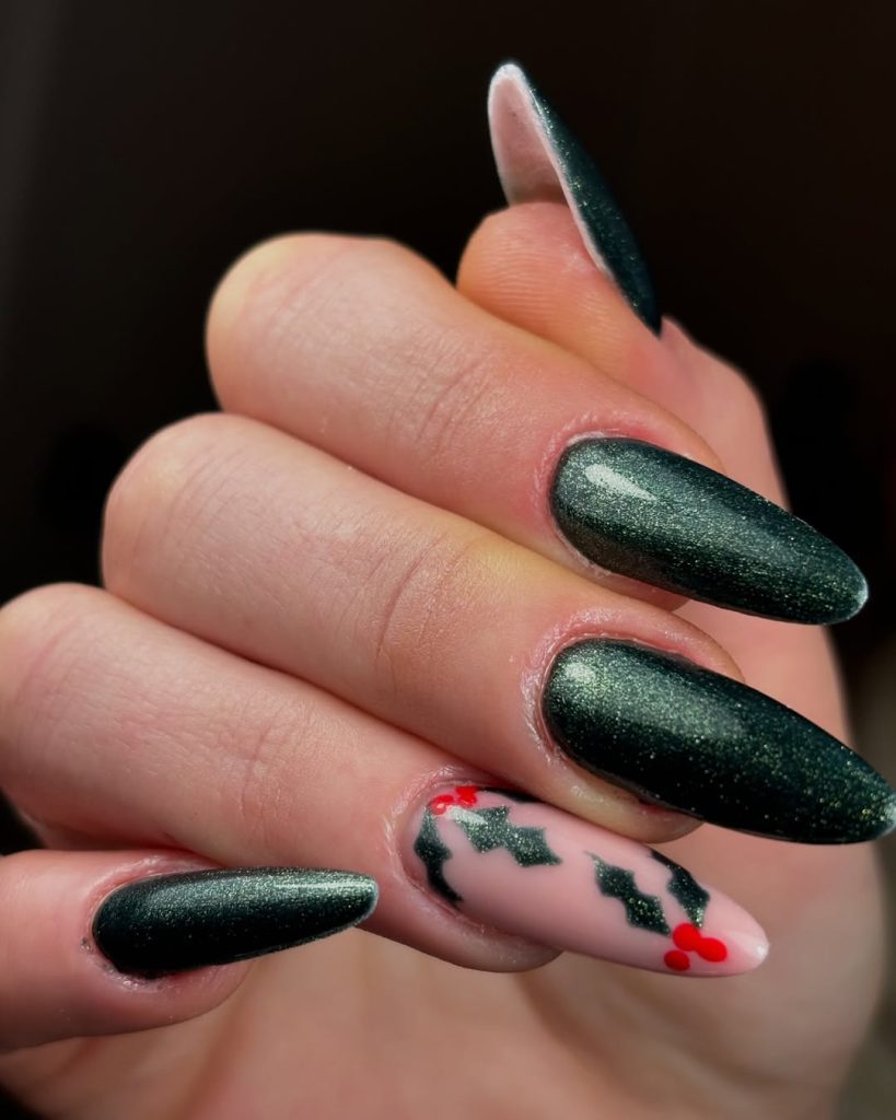Bold and elegant, these metallic green nails shimmer like ornaments under the Christmas lights. The holly accents on a nude base nail add a classic festive detail, making this one of the most sophisticated Christmas nail art designs 2025.
