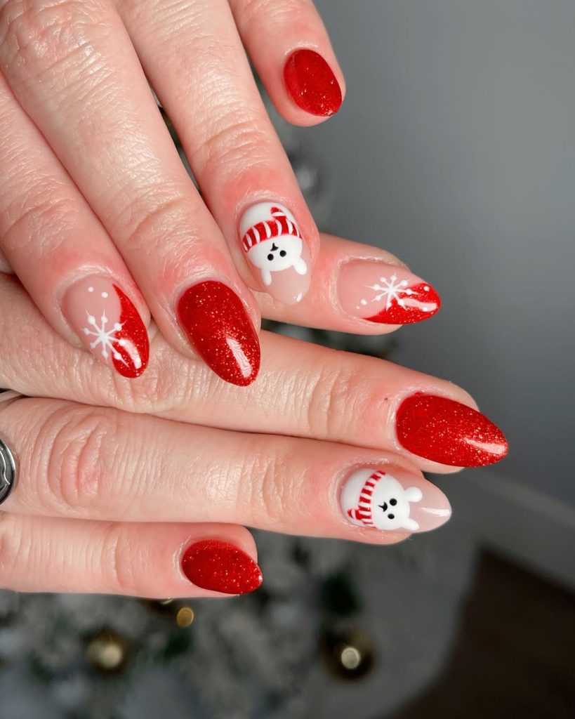 These vibrant red nails sparkle with holiday cheer, blending a rich xmas sparkle red glitter finish with adorable hand-painted polar bear accents. The playful mix of snowflakes, cute winter characters, and bold color instantly puts you in a festive mood. It’s the perfect mix of whimsy and glamour, making this one of the most fun Christmas nail art designs 2025.