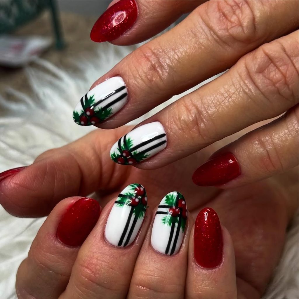 These nails look just like beautifully wrapped Christmas presents. With bold red glitter, crisp white polish, and black ribbon stripes topped with holly, the design feels festive and creative. It’s one of the most playful and stylish Christmas nail art designs 2025.