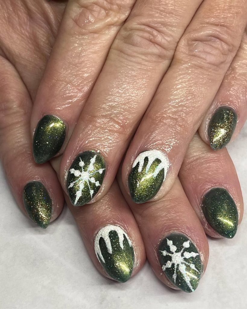 These dark green chrome nails glow with a mesmerizing shimmer that feels both elegant and edgy. White snowflake and drip designs bring the festive theme to life, like frosty windows and holiday cookies fresh with icing. The contrast makes this manicure a standout among Christmas nail art designs 2025, marrying glamour with seasonal playfulness.
