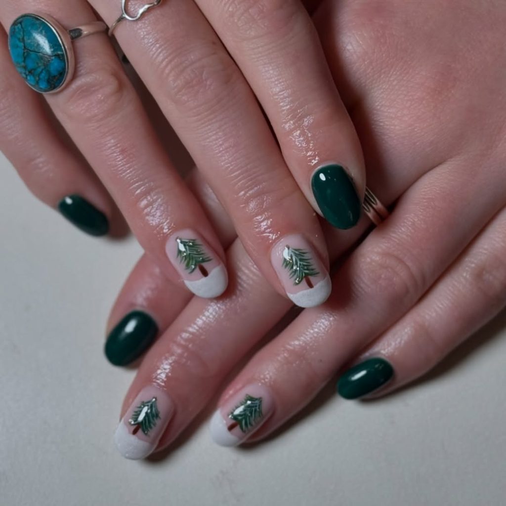 Sometimes the most heartwarming looks are also the simplest, and this Christmas tree design proves it. With dark green nails accented by snowy white tips and tiny evergreen trees, this is one of those cute Christmas nail art designs 2025 that makes you smile every time you look down. It captures the cozy charm of holiday traditions, reminding you of decorating the tree on a winter evening.
