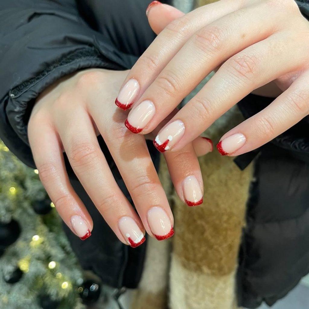 French tips never go out of style, but when you add xmas sparkle red glitter, they suddenly feel festive and chic. This manicure balances elegance with seasonal fun, offering just the right amount of holiday cheer. The square short nails make the look modern and simple, while the red glitter edges glow like ornaments against a winter tree.