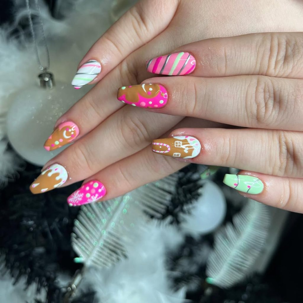 These nails are pure holiday fun, with gingerbread houses, candy canes, and bright pops of pink and green. It feels like a sugar-coated dream, full of playful 3d designs and whimsical details that instantly remind you of decorating cookies. Among Christmas nail art designs 2025, this one is bold, colorful, and totally unique.