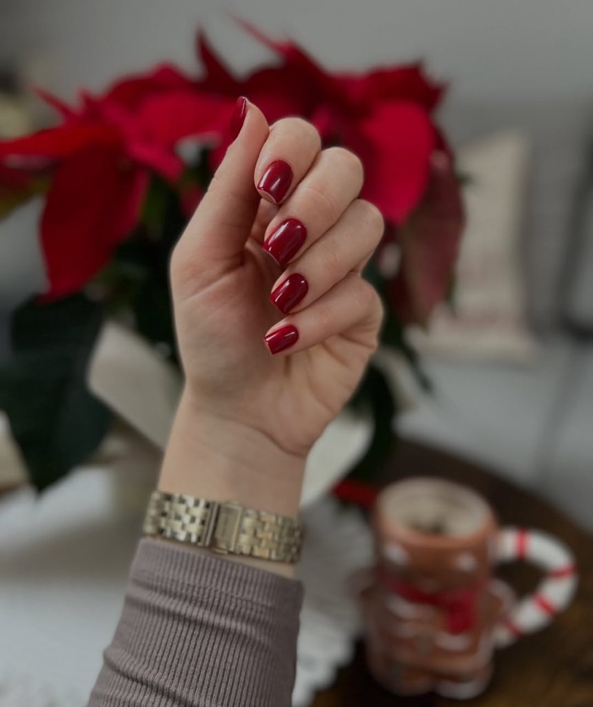 This look is perfect for women who love simple but stylish manicures. Almond simple nails elongate the fingers naturally, and the pearl details bring subtle sparkle. It’s versatile enough to wear beyond the holidays, making it a classy investment in your seasonal look.