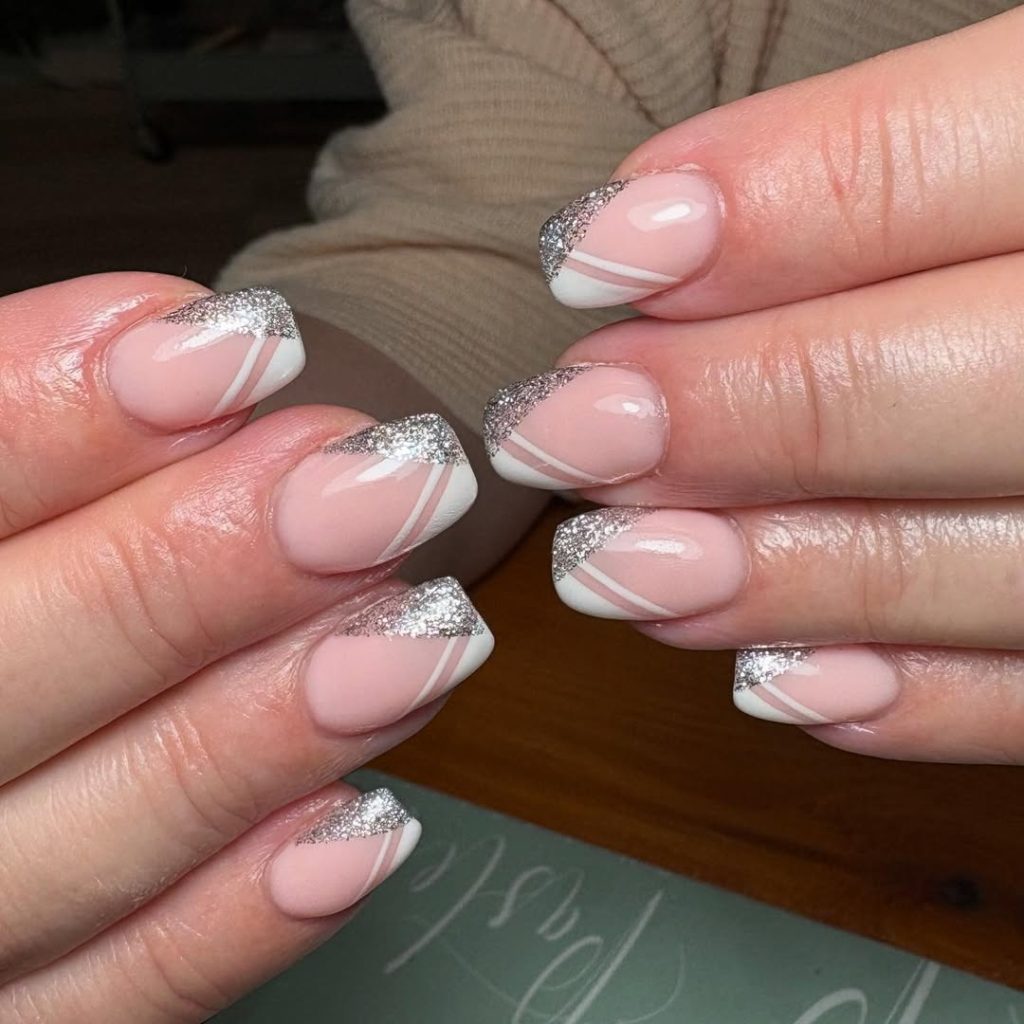 All about sparkle and class are these nails. With soft pink bases topped with an angle of silver glitters and white stripping, it takes the French manicure to the next level, festive and classy and fully visible eye-catching.