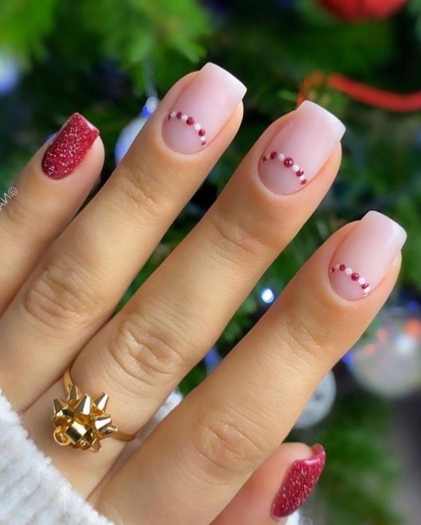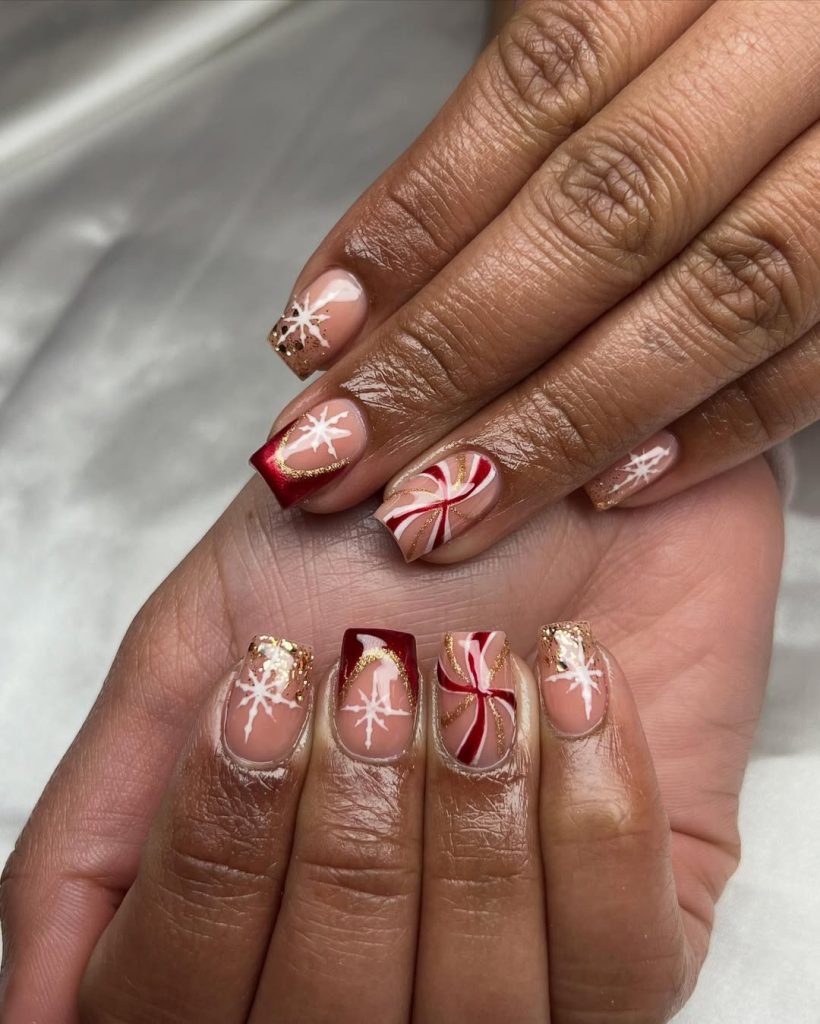 Short square nails are practical yet chic, perfect if you want a design that’s eye-catching but still easy to live with. The little bursts of glitter bring extra holiday shine, making this a very suitable choice for the season.