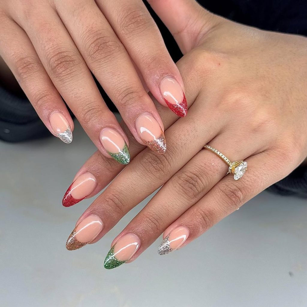 Sometimes less is more, and these glitter-dipped almond tips prove that well enough. A splash of red, green, gold, and silver feels festive without impeding the overall design. It’s sleek, stylish, and instantly recognizable as a holiday manicure.