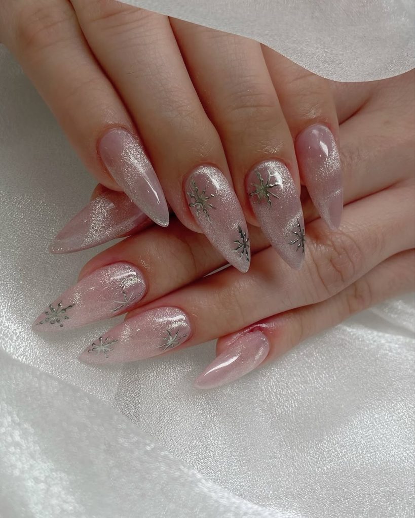 Snowflake design on a soft, shimmering pink nail might feel like a frosty winter morning. The stiletto added a little drama to the design, with the metallic always keeping it classy and wintry.