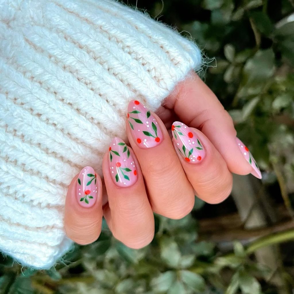 Bright and cheerful, these almond nails are decorated with holly berry and leaf designs over a soft nude base. It’s a joyful and playful twist on holiday art, bringing nature-inspired beauty right to your fingertips.