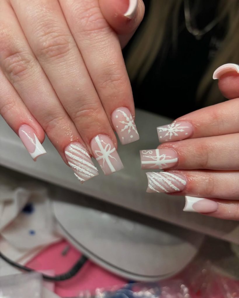 These short-square-from-the-inside nail designs are wrapped like little gifts, complete with bows, stripes, and snowflakes in crisp white. The soft-pink base balances the sometimes very bold art, making it very festive but at the same time elegant.