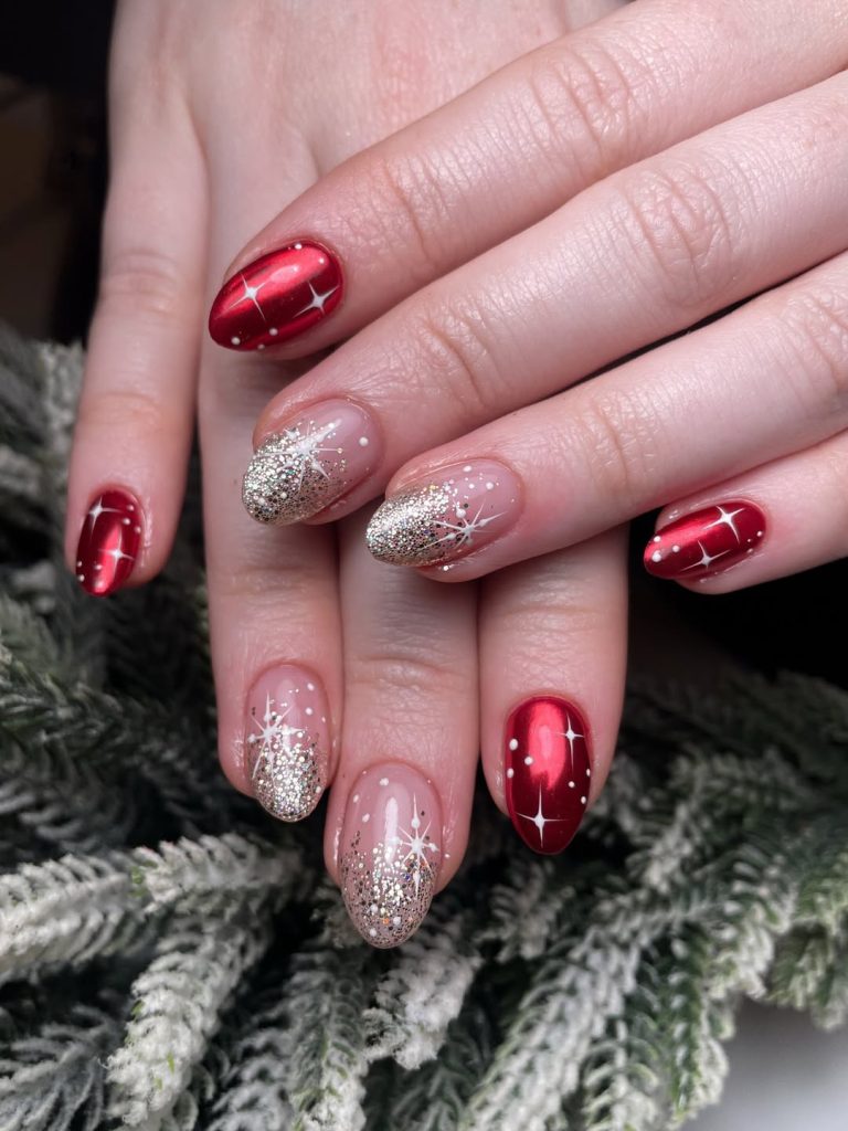This look is wonderful for women who prefer minimal but classy nails. The short square shape is practical for everyday wear, while the glitter tips elevate the look for the season. It’s a manicure you can wear comfortably from Christmas dinners to New Year’s Eve.