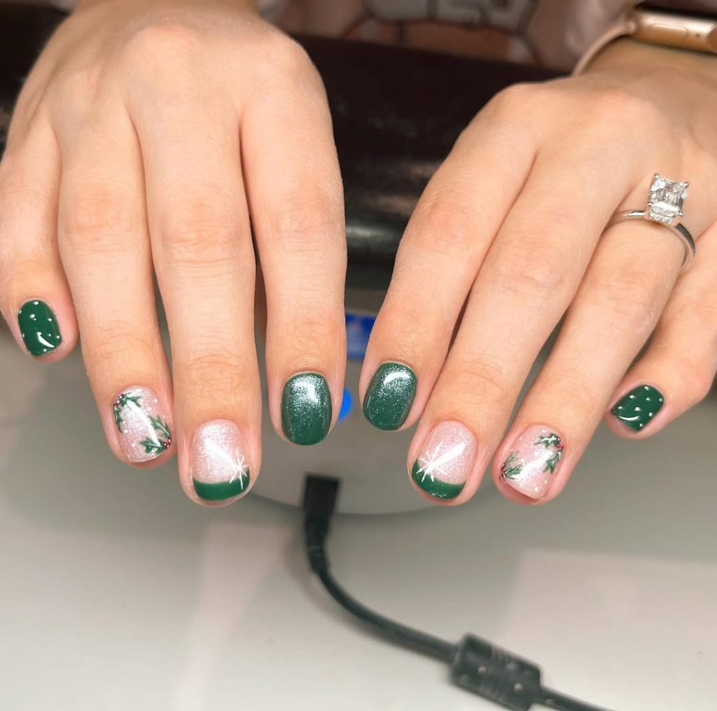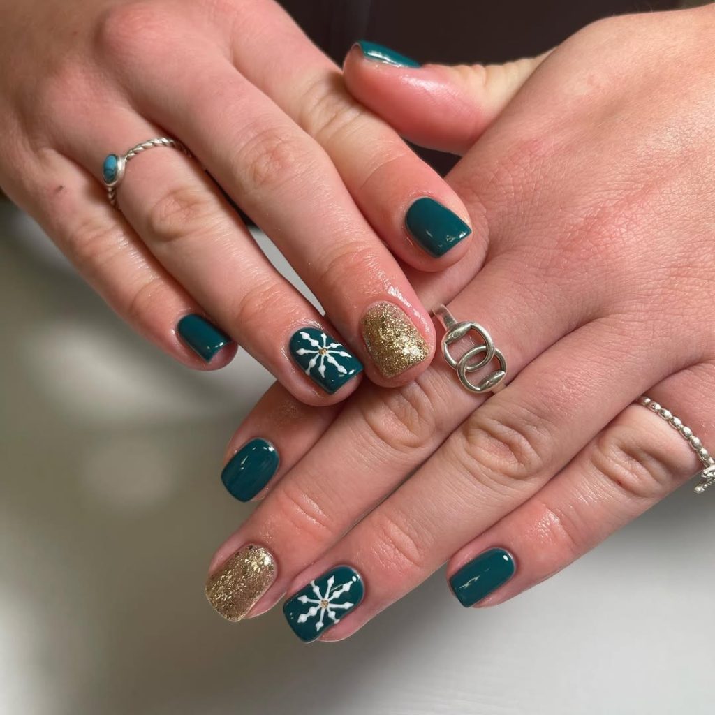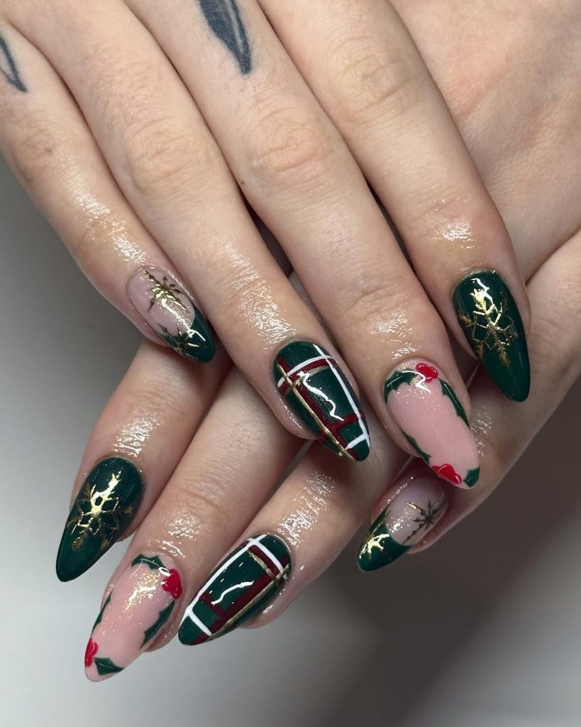 Rich green nails paired with gold accents instantly feel like Christmas decor brought to life. With plaid patterns, holly details, and sparkling snowflakes, this manicure is bold, vibrant, and unmistakably holiday-ready.