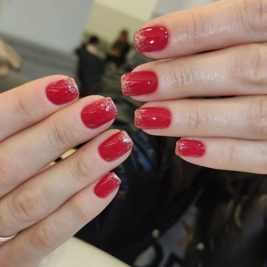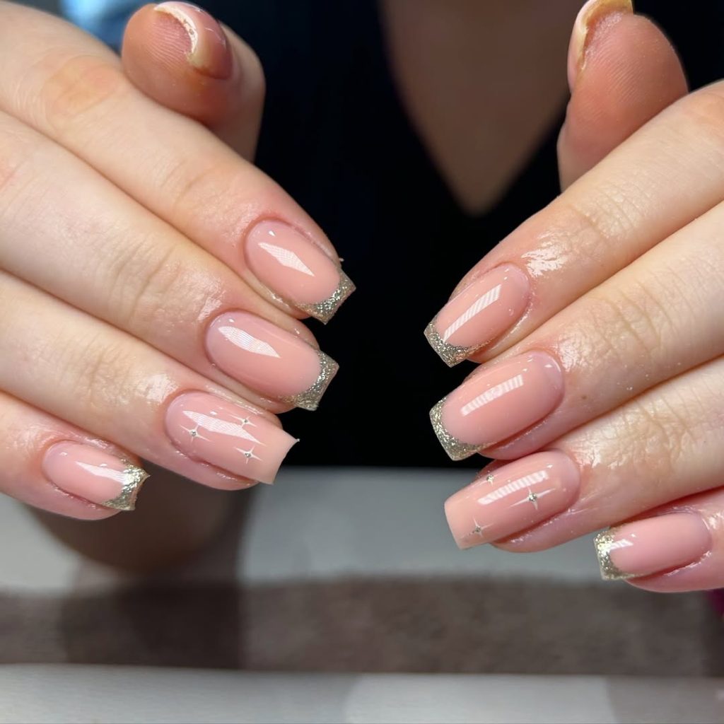 Simple yet glamorous, these short square nails feature nude bases with fine golden glitter tips. The design is delicate, polished, and versatile, giving just enough holiday shimmer without feeling too busy.