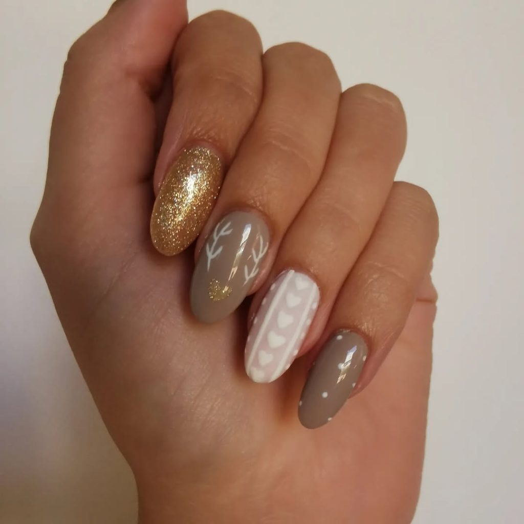 With soft taupe, gold glitter, and white sweater-inspired art, these nails capture the warmth of a cozy winter evening. The mix of patterns gives them a stylish yet homely feel, making them perfect for women who love seasonal comfort.