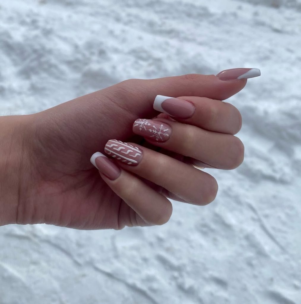 Slightly playful, these nails combine a French tip with some subtle art from a snowy winter scene. The almond shape softens the effect, and the snowflake-and-sweater knit patterns just add a bit of holiday spell. It is an instant mood uplift—very traditional with a pinch of whimsy.