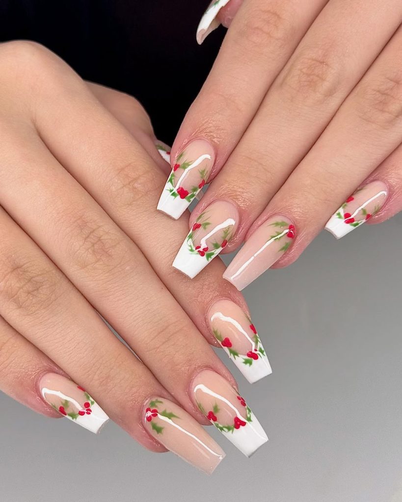 These coffin nails look as if they have been decorated with holly garlands, with each white French tip adorned with red berries and green leaves. It’s festive, very pretty, a wonderful way to bring seasonal cheer into your manicure.