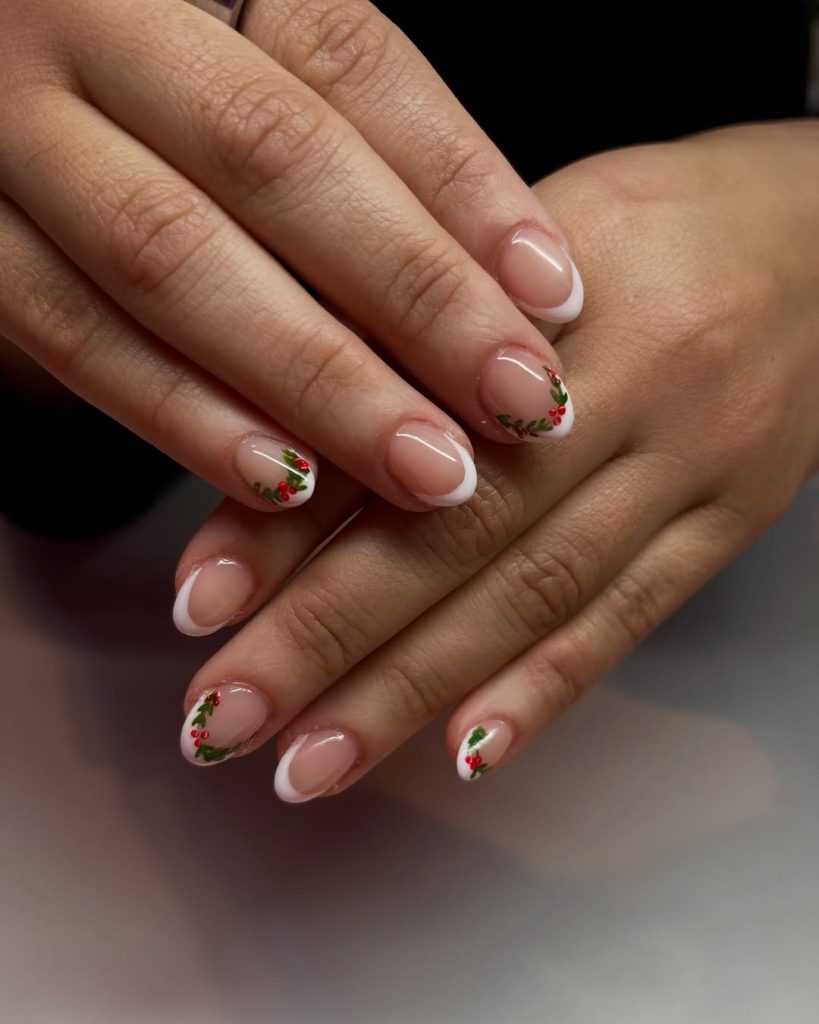 Classic French tips with a Christmas flair come together in this simple yet charming manicure. White tips with little holly berry accents make for a look that is elegant yet subtle enough to nod toward the holidays.