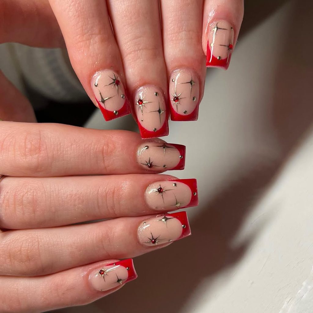 These short square nails combine classic red French tips with starburst sparkle art. This fun star detail design keeps the holiday feel retro and festive, making it a very sophisticated choice.