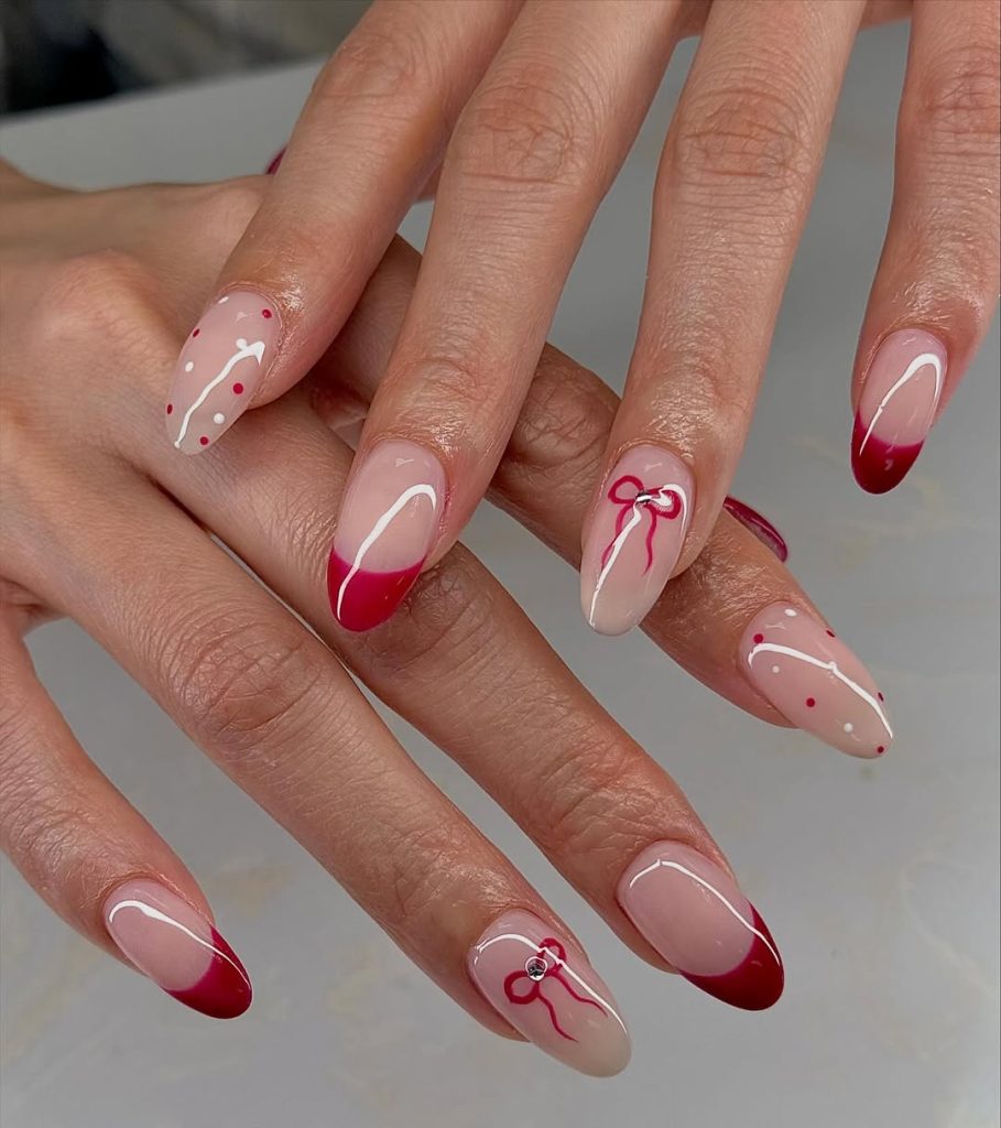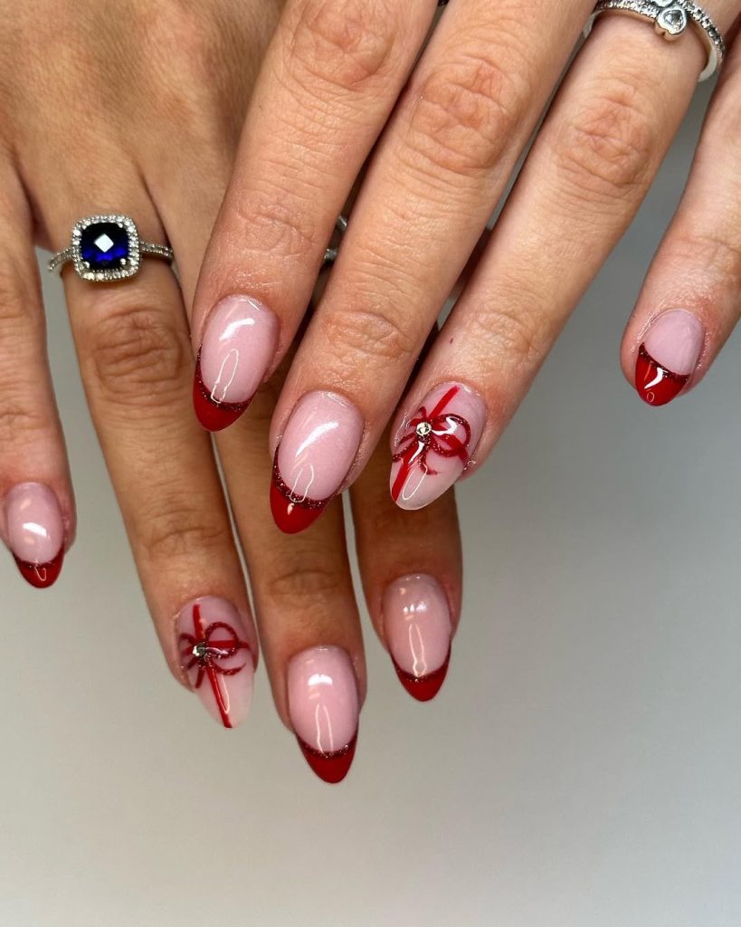 If you love almond shape nails, this look is especially flattering for longer fingers and works beautifully with both natural and acrylic bases. The bows add a touch of art without being overwhelming, making it ideal for women who want festive flair but still crave an elegant manicure.